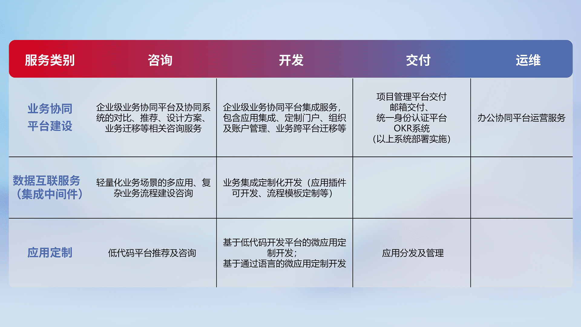 针对钉钉、、企微、、、、IDaas等平台级产品提供产品的规划、、、方案、、、、交付、、、、定制化开发等服务,,,,实现如统一协同办公、、智能客户服务、、、、混合会议管理、、、智能数据查询、、等业务场景,,实现数字化转型。。。